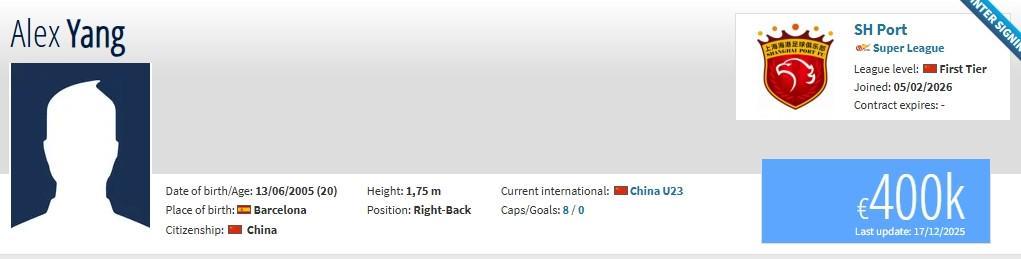 北京时间2月5日,德转更新,青岛西海岸20岁后卫杨希加盟上海海港。杨希现年20岁,司职后卫,出生在西班牙,出自西班牙人青训。杨希在2025赛季加盟青岛西海岸,效力期间共为球队在各项赛事出场23次。在刚结束的U23亚洲杯中,杨希共为U23国足出场6次,帮助球队创造历史获得亚军。现在他在德转上的身价为40万欧元。...
