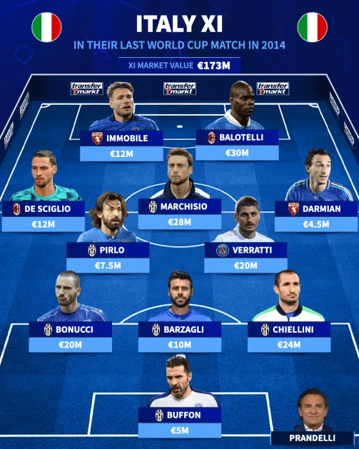 回顾2014年世界杯,意大利对阵乌拉圭的最后一场小组赛,意大利以0-1输给了乌拉圭,遗憾未能晋级到淘汰赛阶段。这场比赛是意大利最后一次出战世界杯。当场首发球员有: