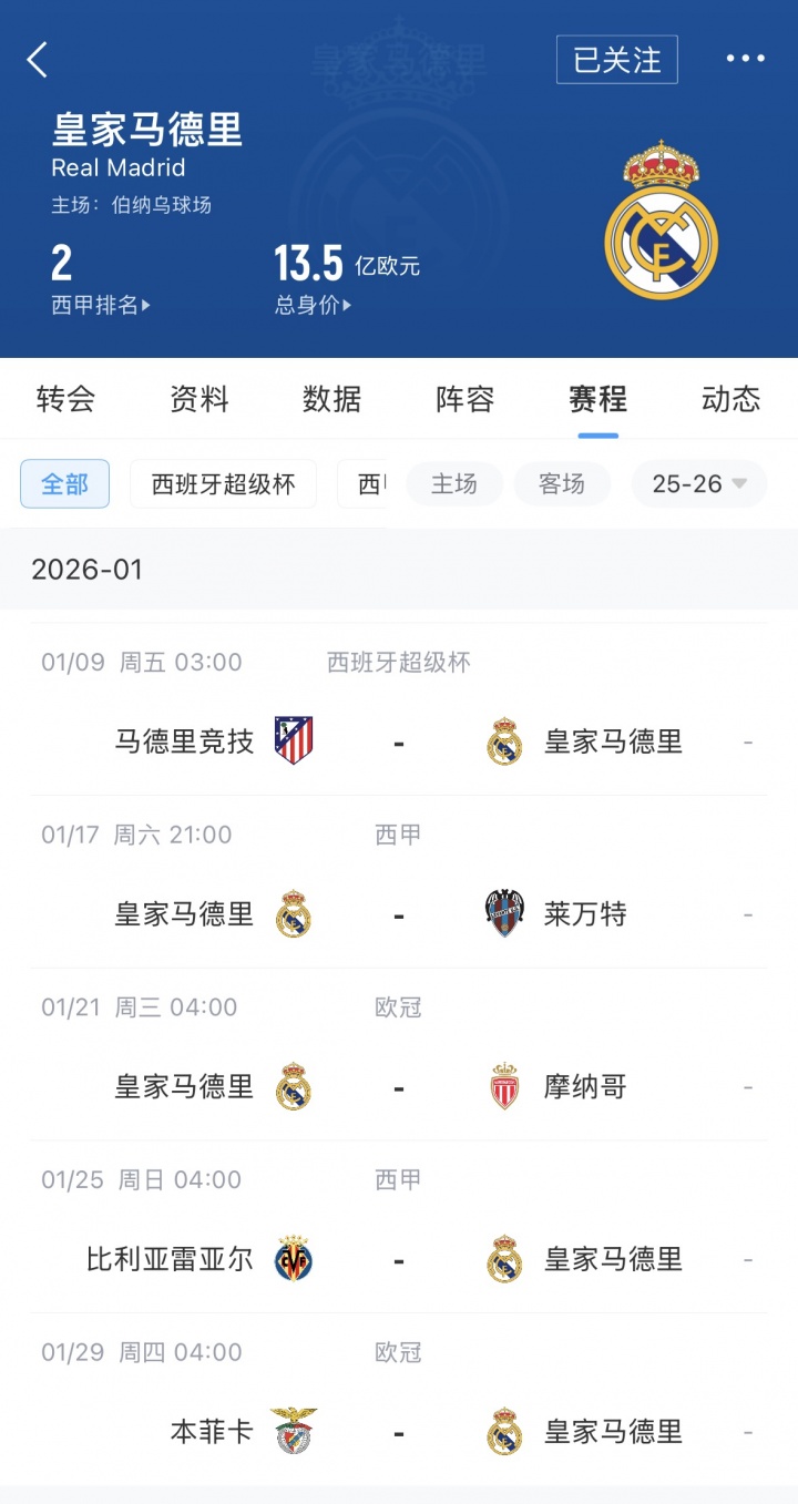 皇马本月赛程: