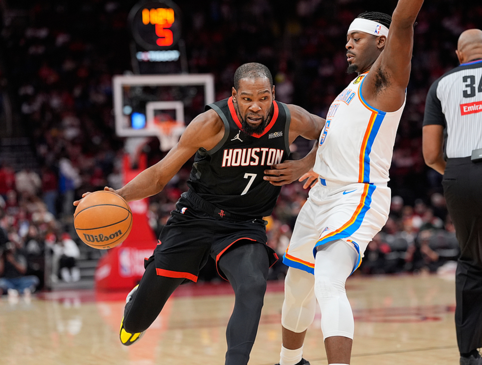雷霆赢球后5连胜,战绩35胜7负排名联盟第一,火箭输球后23胜15负,排名西部第六。