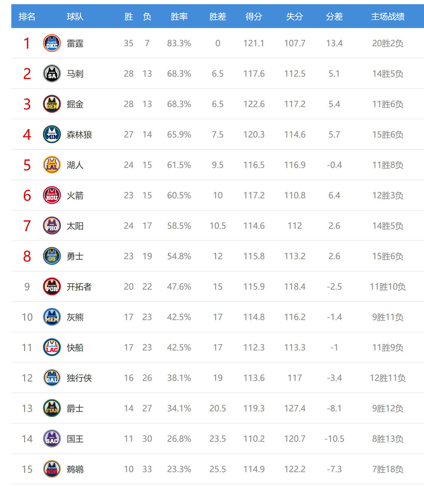 今日比赛后马刺、掘金排名互换,其他西部球队排名不变。